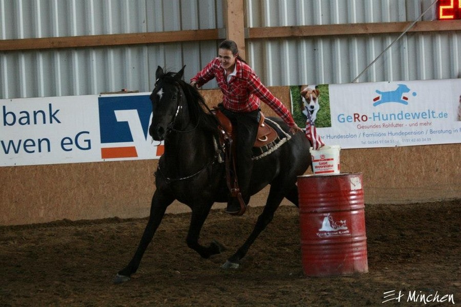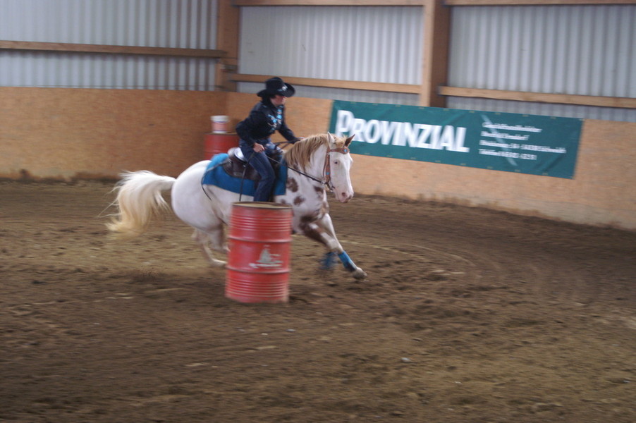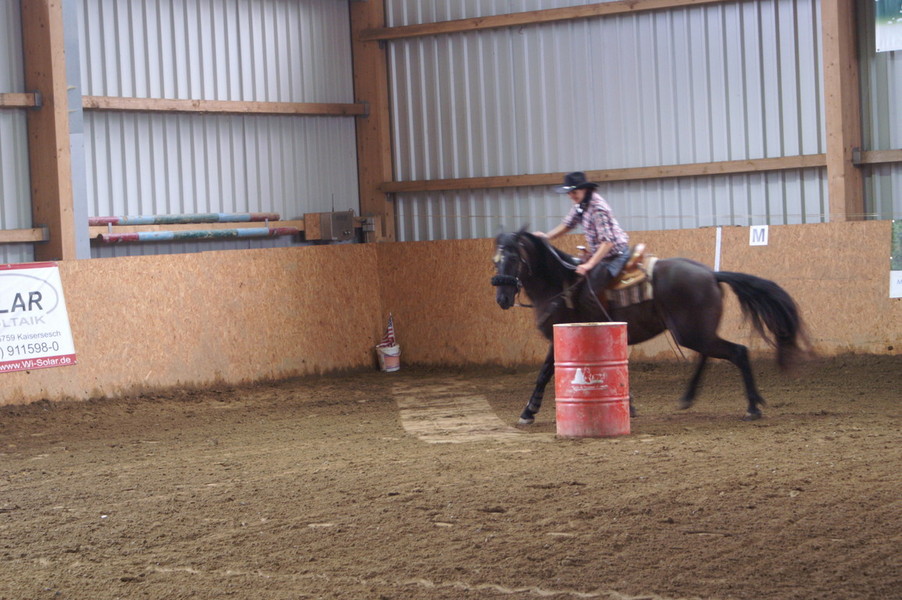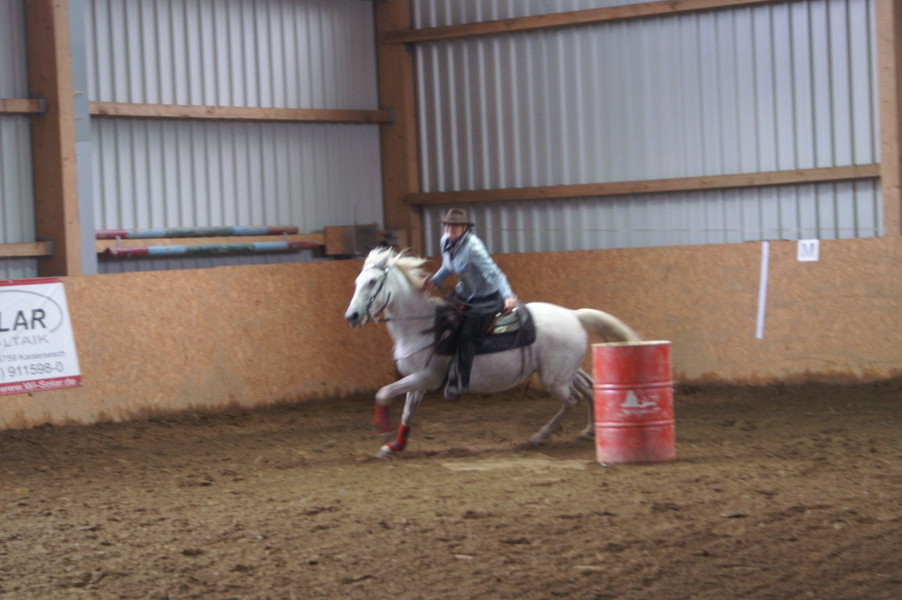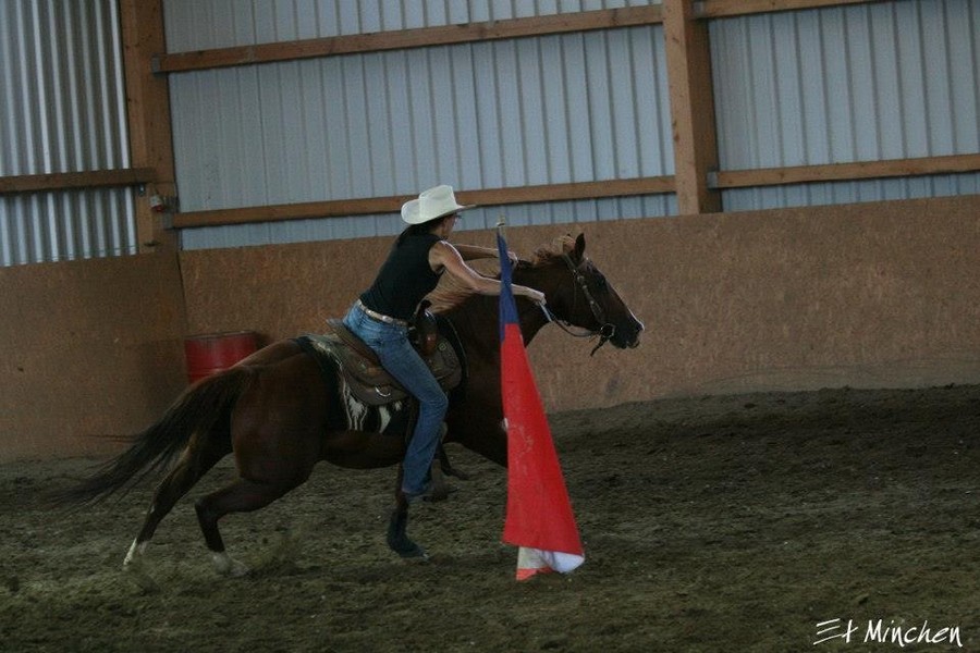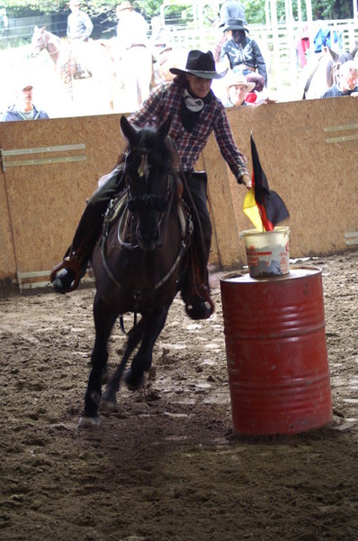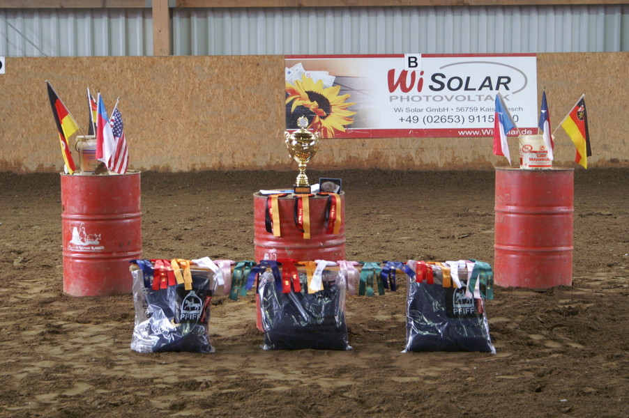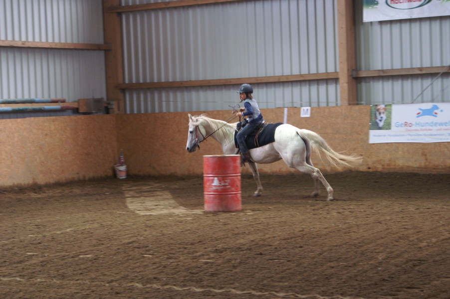 Vom Prinzip her eigentlich ganz einfach: Beim Flag Race werden 4 Tonnen auf dem Hufschlag umritten. An jeder Ecke steht eine Tonne. Du schnappst Dir aus Tonne 1 die Fahne und eilst damit zu Tonne 2: Im Sandeimer versenken! Flitzt weiter zu Tonne 3, greifst dir die Fahne und steckst sie in Tonne 4. Das Ganze möglichst zackig!!!